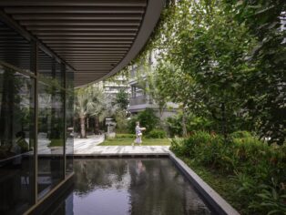 Rather than a monolithic development, The Reef’s 429 residences are distributed across ten blocks of varying heights, arranged as a carefully composed trio of building types—Courtyard, Tower, and Villa blocks. Together, they frame a sequence of semi-public spaces rich with vegetation along the waterfront. The blocks gradually step down from 10 to 5 storeys, opening a vital view corridor from Mount Faber to the water while creating a lively, varied skyline. This arrangement around intimate garden pockets fosters an authentic sense of neighbourhood—what the project calls an Urban Village—where generous communal amenities and human-scale design create natural gathering points and visual connections throughout.