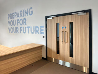 Corridor doors feature Dormakaba electro magnetic closers with double-action configuration. The built-in hold-open functionality, means that the closers hold the doors open for ease of movement around the college, yet will automatically close in the event that a fire alarm is activated, therefore compartmentalising the fire. These highly efficient closers require a low opening force, ensuring doors can be opened with ease by all building users.