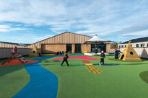 The first floor exterior, up to the pitched roof – is finished with timber cladding, chosen to add further affinity with the nearby green belt. “It provides a more natural setting and identifies the school, along with the shape of the roof,” explains Mognini. “It’s become quite an identity for the school.”