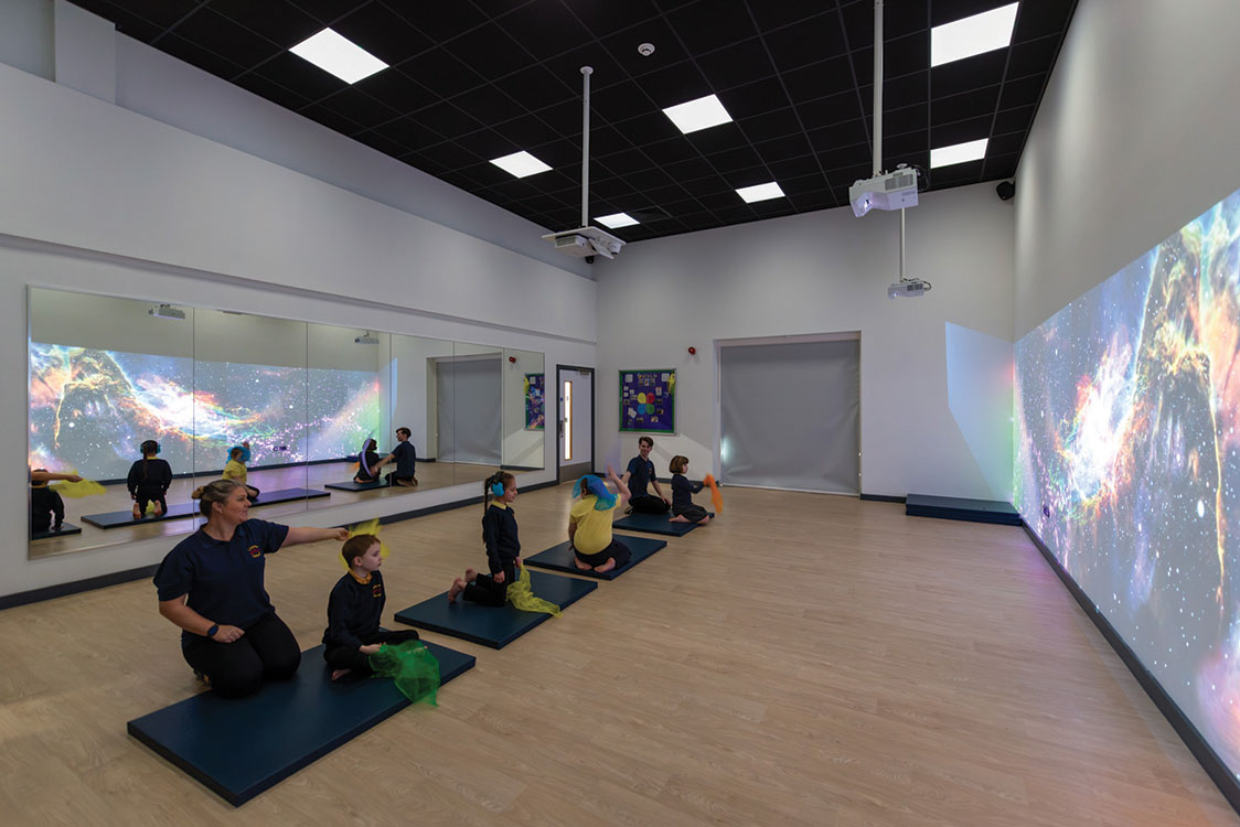 Pupils also have access to a cookery room finished with accessible workstations so they can take part in hands-on cooking activities and a dance studio which features a 10 metre x 2.4 metre tall immersive wall and interactive floor. There are also CAMHS (Child and Adolescent Mental Health Services) spaces, and a ‘zen den’ designed to help students who need a space to relax and self-regulate.