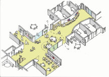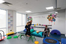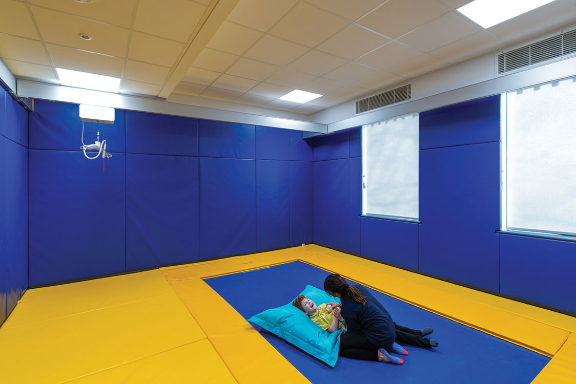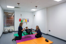 Other specialist rooms throughout the school include physiotherapy rooms, a multifunctional sensory room which incorporates body rollers, storage swing hooks, a large swing bolster and mats for therapeutic activities, a rebound therapy room which includes a trampoline, and a soft play room equipped with various elements for active exploration and play. There is also a dark therapy room that allows for relaxation and sensory exploration, as well as therapeutic interventions with equipment including a solar projector, UV carpet, and liquid