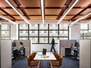 Within each suite, a grid of familiar columns punctuates the open space, serving as more than just structural support for the building, but also as a distinctive aesthetic feature that defines the identity of the third floor. Color-coded acoustic panels line each of the suite’s ceilings, combining with the bright visual aesthetics of each space while simultaneously ensuring the acoustic comfort of each room.