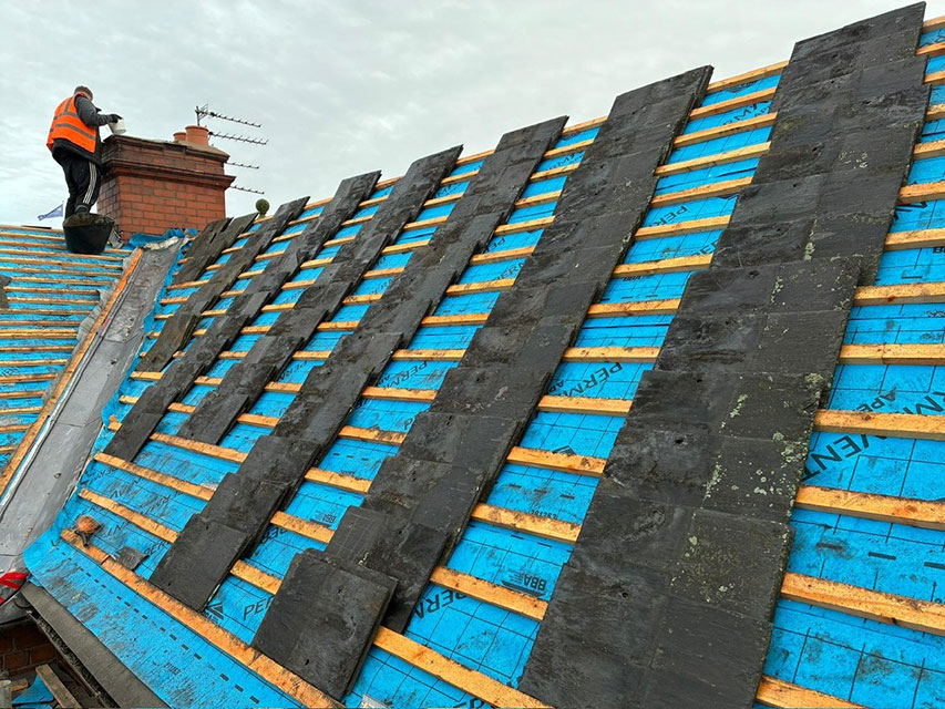 The roofing works are being delivered by Roofrite (Shropshire) Ltd, with Permavent supplying Apex membrane to enhance the performance and longevity of the roof structure. The membrane has been selected for its ability to provide reliable weather protection while maintaining breathability, an important consideration for buildings in constant, year-round use. Support is also being provided by other contributors who have kindly donated materials free of charge, including Boden Roofing Supplies (50x25mm battens), SIG (new 500x250mm Spanish slates) and Manthorpe (ventilation products).