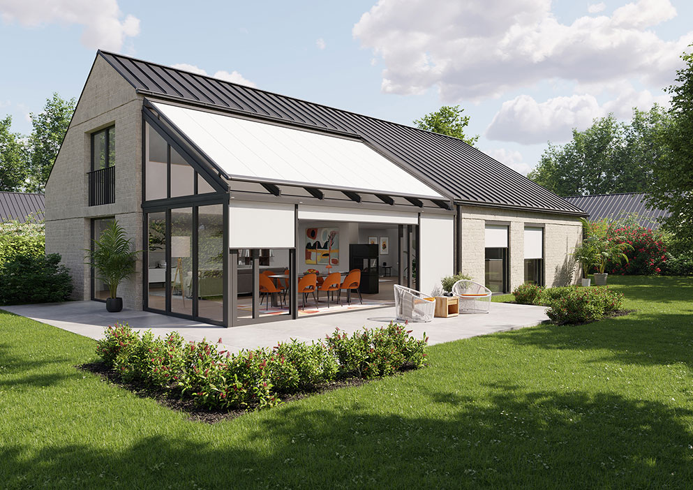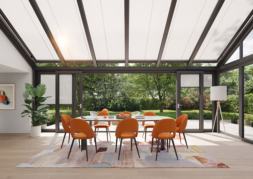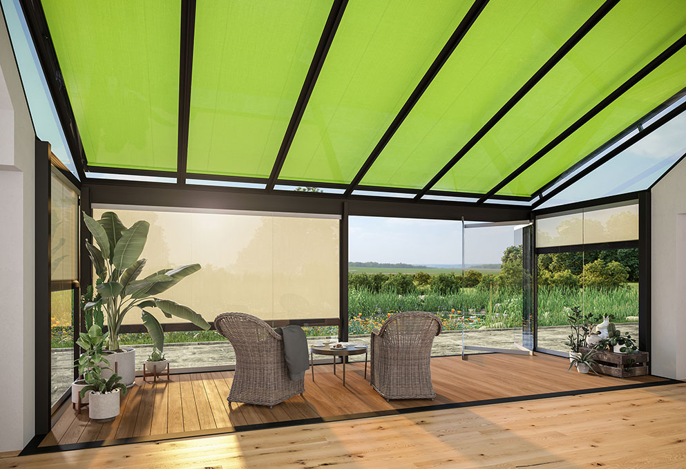 Recharging your batteries and enjoying the sun when it’s still cool outside or simply spending a summer’s day under a sheltering roof: there are plenty of reasons why people add a conservatory or a glass canopy to their house. Additional spaces such as these, bathed in light, are really in vogue. However, if there is no protection against the sun’s rays, the temperature inside can become unpleasantly hot during the summer.