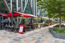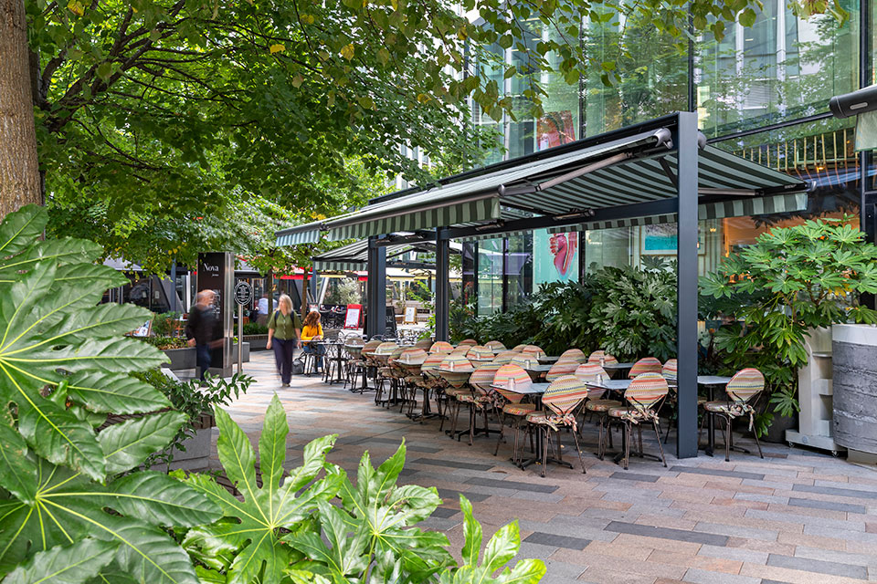 In the middle of London’s bustling Victoria district, directly north of the railway station, a formerly traffic-heavy area has been transformed into a modern, vibrant neighbourhood: Nova Victoria. An ensemble of office and residential buildings has been created on an area of around 83,300 m², flanked by spacious hospitality and leisure areas. The result of the remodelling is a vibrant urban quarter that attracts residents, office workers and visitors alike. Thanks to numerous markilux awnings, this area can be enjoyed regardless of London’s fickle weather.
