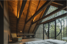 The main living room thus retains the atmosphere of an enclosed, safe, and intimate space. Its dimensions—and subsequently the scale of the other rooms—were determined by one of the few preserved elements: the exposed beam ceiling. This defined both the clear height and the overall proportions of the space. Thanks to a combination of operable and frameless glazing, the rhythm of the traditional structure has been preserved in both the exterior and interior, while at the same time the interior opens up to views of the surrounding landscape.