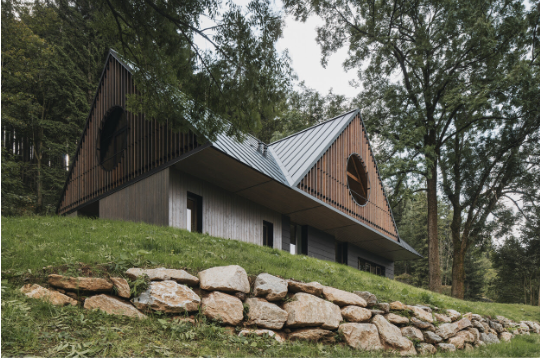 Buildings in the Krkonoše Mountains are defined by massive, steep roofs that once made it possible to survive the long winters. With hayloft dormers, an asymmetrical roof set on a low log structure creates a sheltered porch, boarded gables, stone plinths, and a traditional tripartite layout. It was precisely such a house that we sought to return to its rightful place.