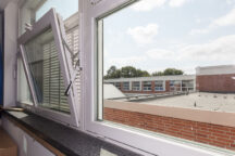 While insulation simplifies winter heating, it complicates summer cooling. To tackle this, venetian blinds were installed on the south-facing façades to reduce solar gain. At night, when temperatures drop, classrooms are cooled via Renson’s 431 RC2 wall louvres—an elegant, secure solution that allows fresh air in while keeping insects and intruders out.
