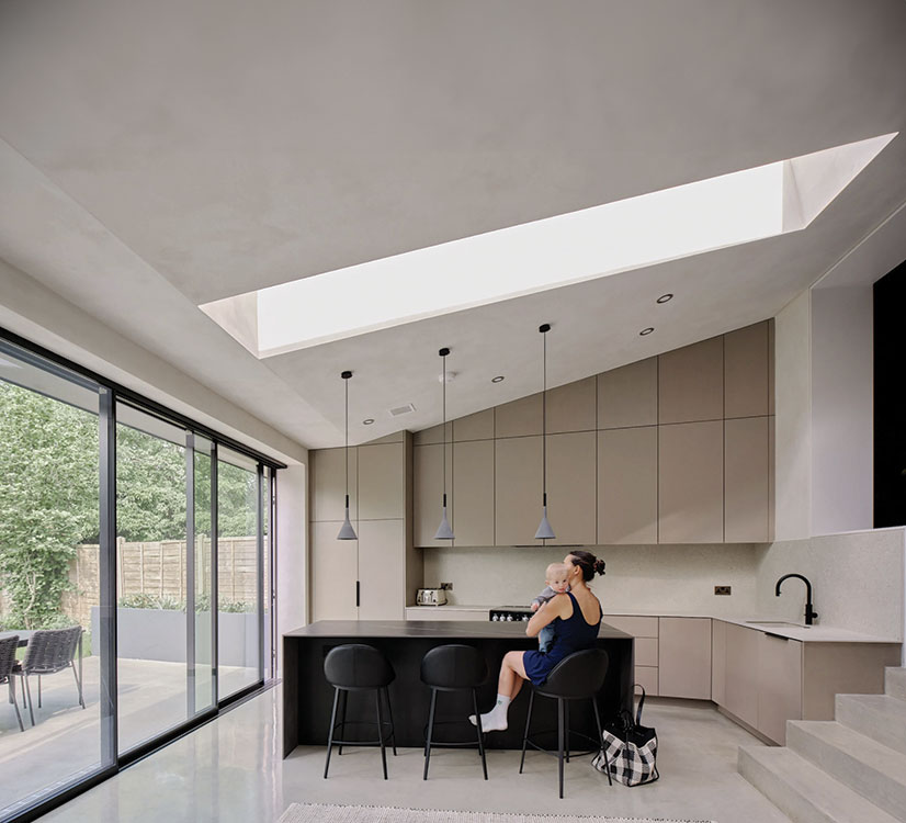 The most successful projects combine multiple passive strategies: cross ventilation where the plan allows, stack ventilation using stairwells, secure night time purge routes and MVHR systems with summer bypass. High-level openings such as rooflights or clerestories are particularly effective. Each litre of warm air leaving at the top of the house draws cooler evening air in at lower levels, delivering comfort gains disproportionate to their cost.