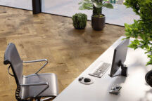 This approach is embedded in Karta’s five-layer construction. A cork backing provides acoustic absorption, thermal insulation, and underfoot comfort, while removing the need for a separate underlay. A PEFC-certified wood fibre core, formed from recycled timber and underused parts of the tree, delivers structural stability and efficient use of resources. A recycled leather layer, created from post-industrial waste sourced across Europe, introduces impact resistance and diverts material that would otherwise be sent to landfill.