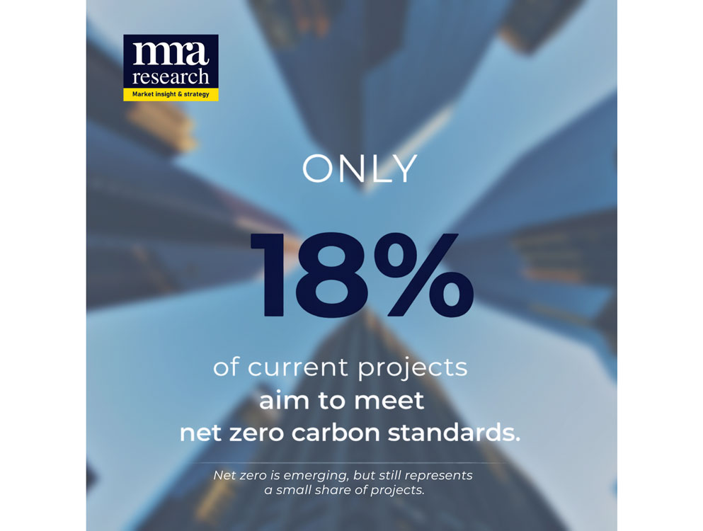 Research among 65 UK architects shows that only 18% of current projects aim to meet net-zero carbon standards. While net zero is beginning to feature, it still makes up a relatively small share of projects overall and will need to rapidly increase.