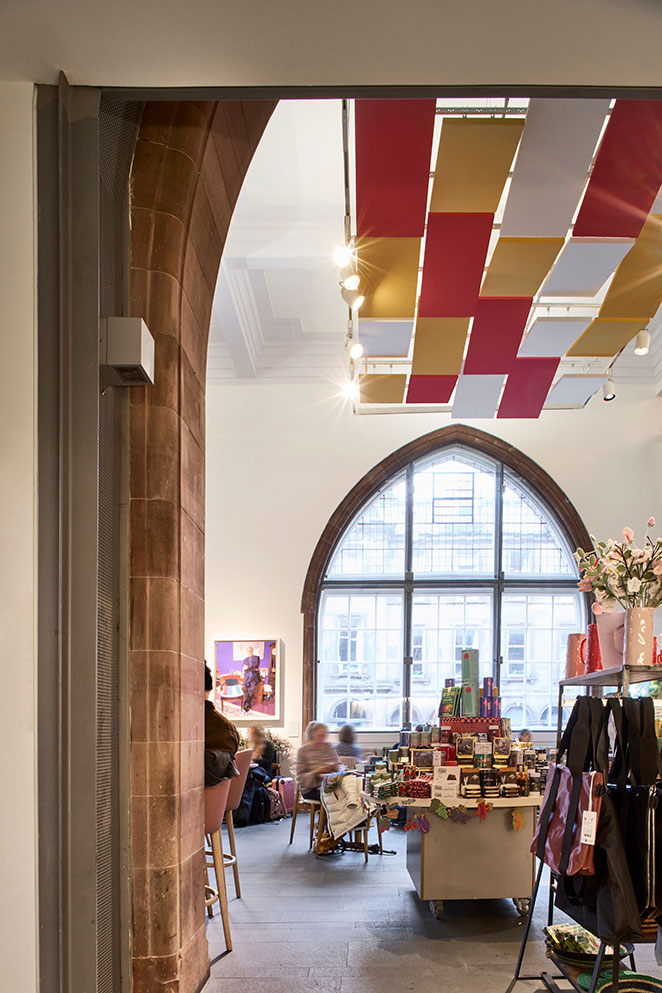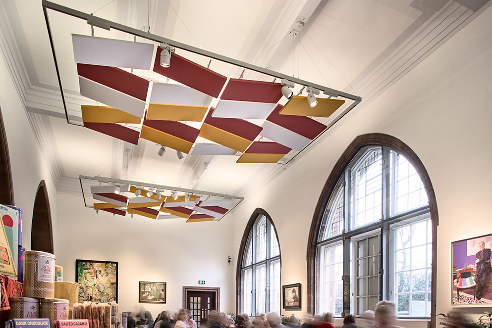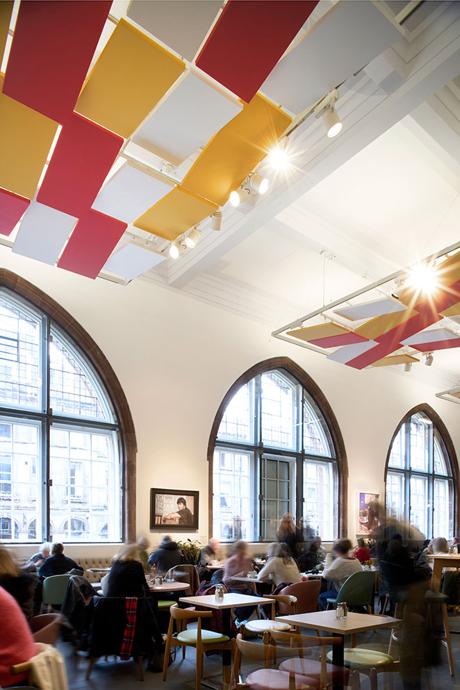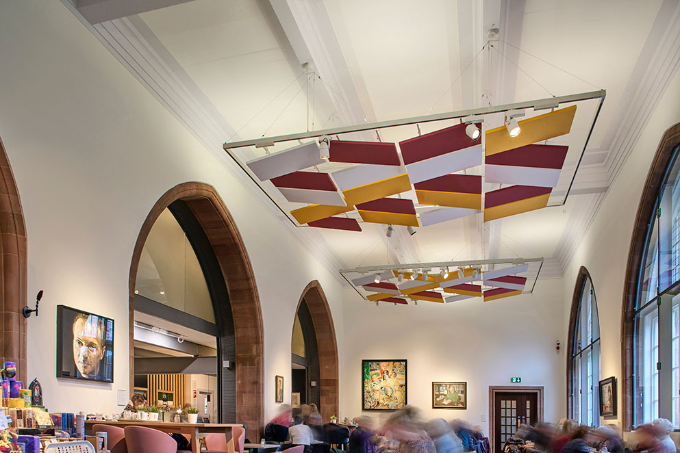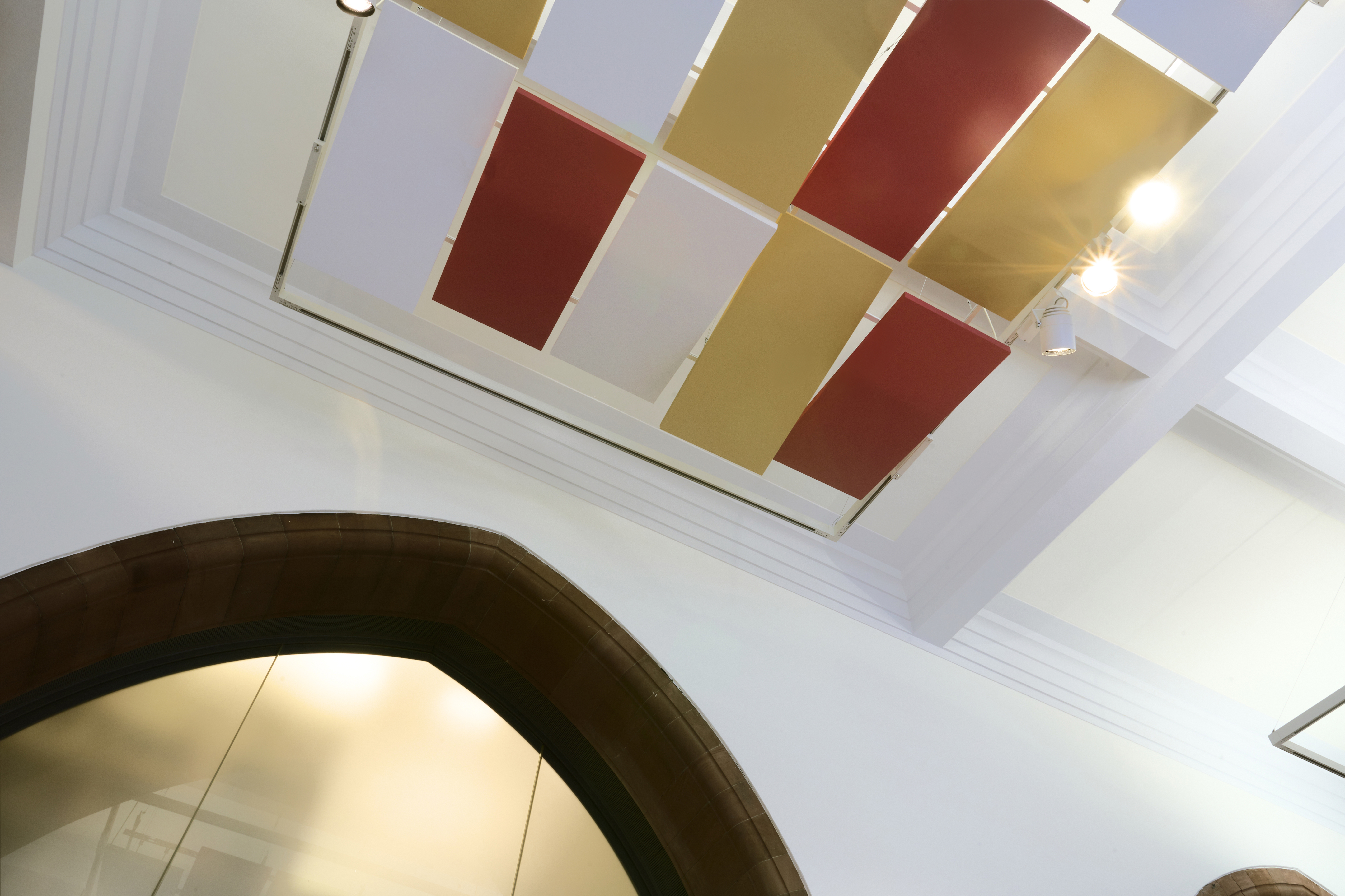 Space Solutions designed three art installations in the existing lighting tracks that could also function as acoustic rafts. Featuring multi-coloured panels at different angles, these rafts not only address acoustic challenges but also complement the Gothic architecture.