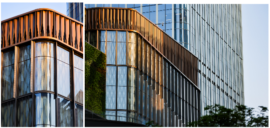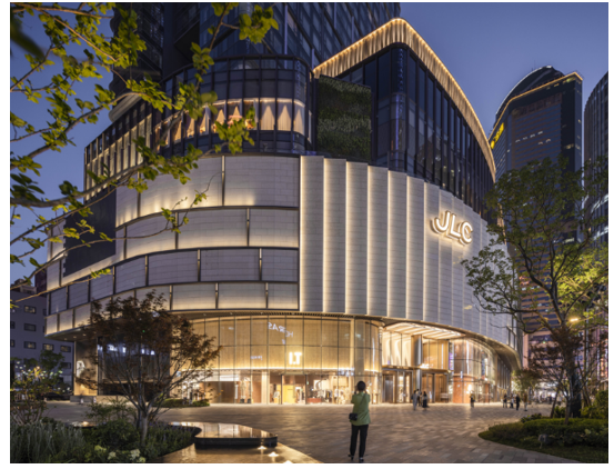 The architectural façade of JLC takes cues from Nanjing’s historic city walls, reinterpreted through a refined material palette. Bronze-toned metal panels, glass, multimedia elements, and integrated lighting create a layered, visually dynamic exterior. Stone textures and sculptural forms add depth and sophistication, resulting in a bold, contemporary expression. By night, a large naked-eye 3D screen transforms into a luminous urban landmark, establishing a striking new visual focal point in the cityscape.