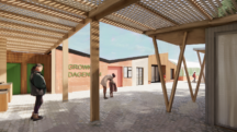 - Timber canopy entrance as a welcoming arrival point and all-weather space