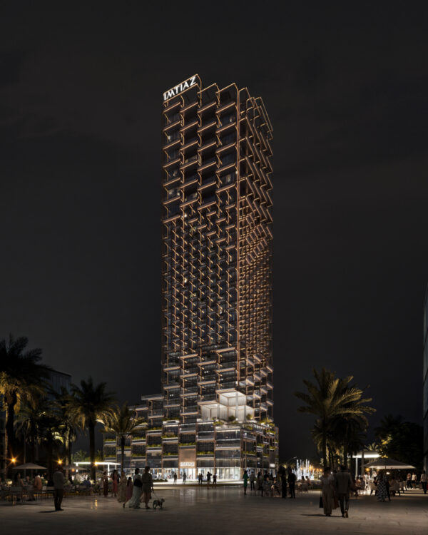 Drawing inspiration from the distinctive three-dimensional geometries and detailed embroidery of Al Sadu and Talli—the traditional Emirati crafts of weaving with metallic threads—the tower’s exoskeleton defines an interlaced façade that appears to transform in tone and depth as the sun moves across the sky throughout the day.