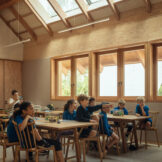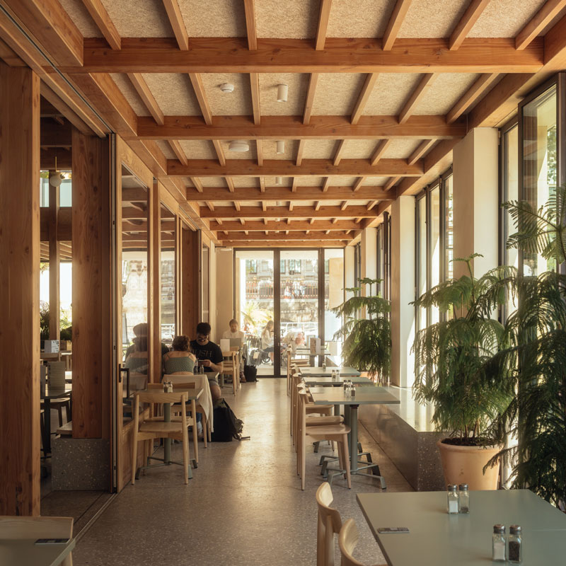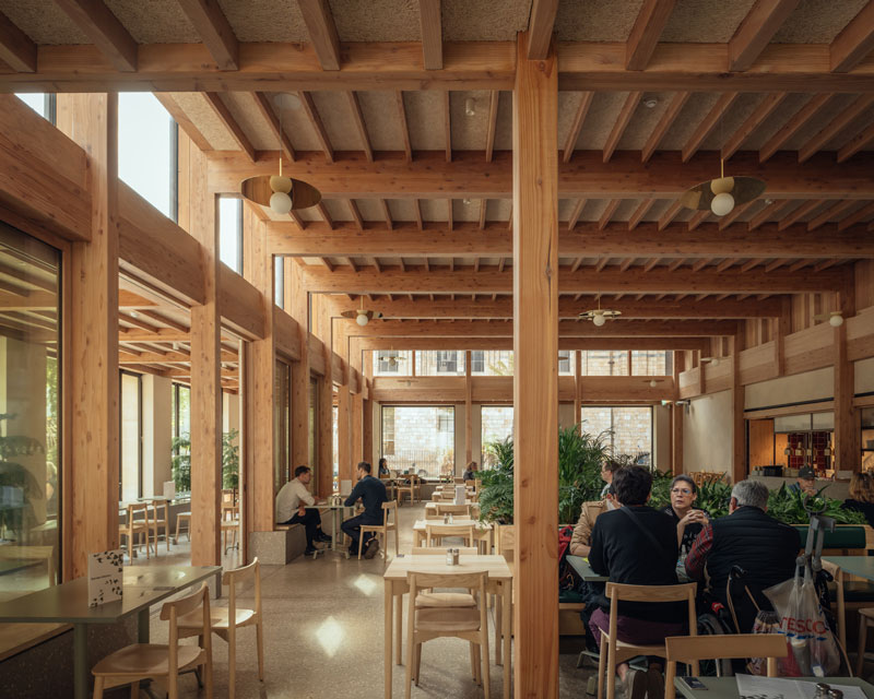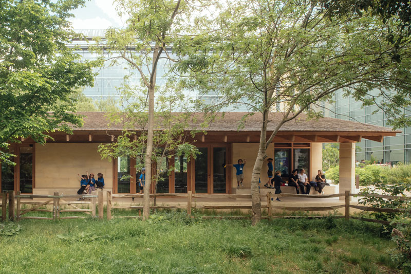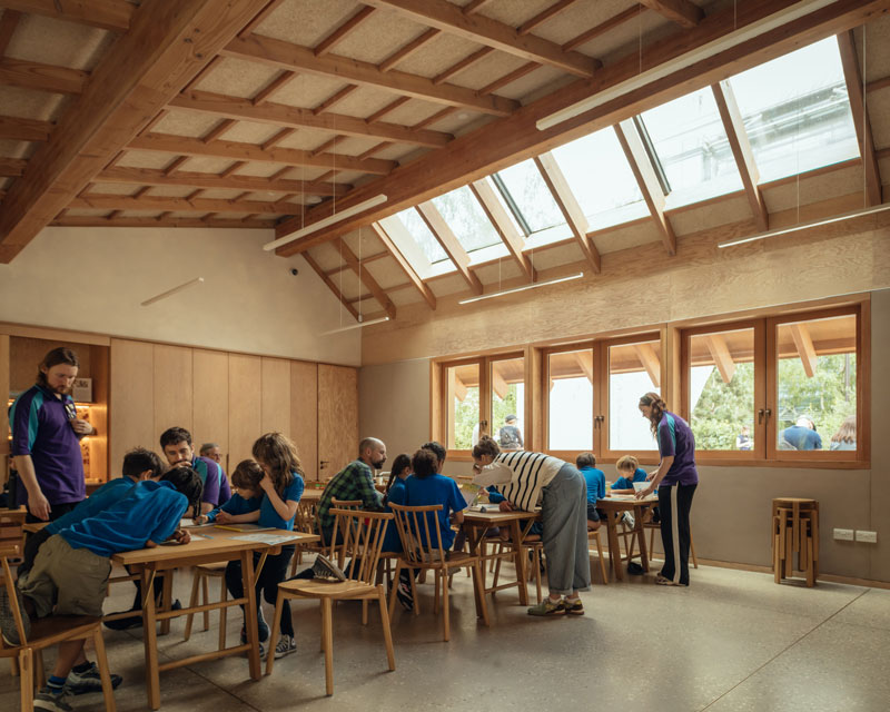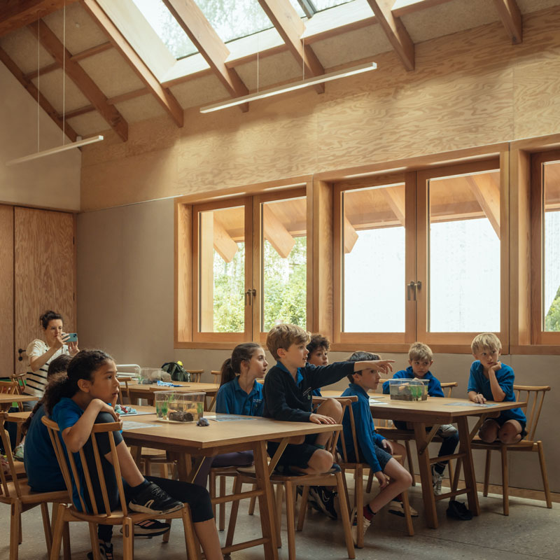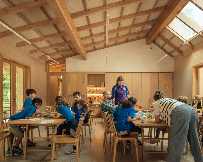 The Nature Activity Centre and Garden Kitchen blend in harmony with the green space and have been designed in close association with the museum’s scientists with thought and care, using natural materials with low embodied carbon. The frame is created from UK limestone under a Douglas fir roof with cedar shingles. Douglas fir doors, windows and columns adorn the inside. Working with acoustic consultants Max Fordham, Troldtekt wood wool acoustic panels have been utilised through the ceilings to help combat reverberating sound and create a calm and welcoming atmosphere.