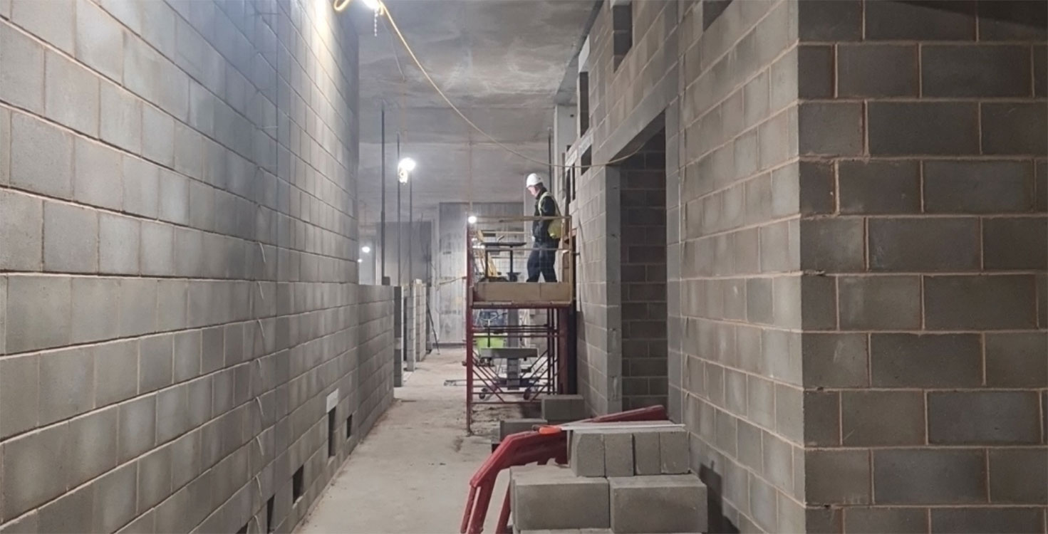 Swift Brickwork’s remit covers approximately 14,000m² of blockwork, including three levels of complex basement construction. The team worked from Stage 4 design onwards, integrating mechanical, electrical and plumbing (MEP) models with blockwork requirements to ensure buildability throughout the basement and superstructure.
