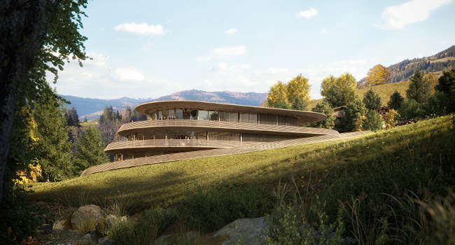 “Our design generates a spectacular arrival experience, as the building comes into view from the road. Its facade is made from local larch and diffuses natural light into the spaces above ground, while providing panoramic views of the valley. An integrated ramp activates the whole building, with continuous circulation from the ground level to the penthouse.”