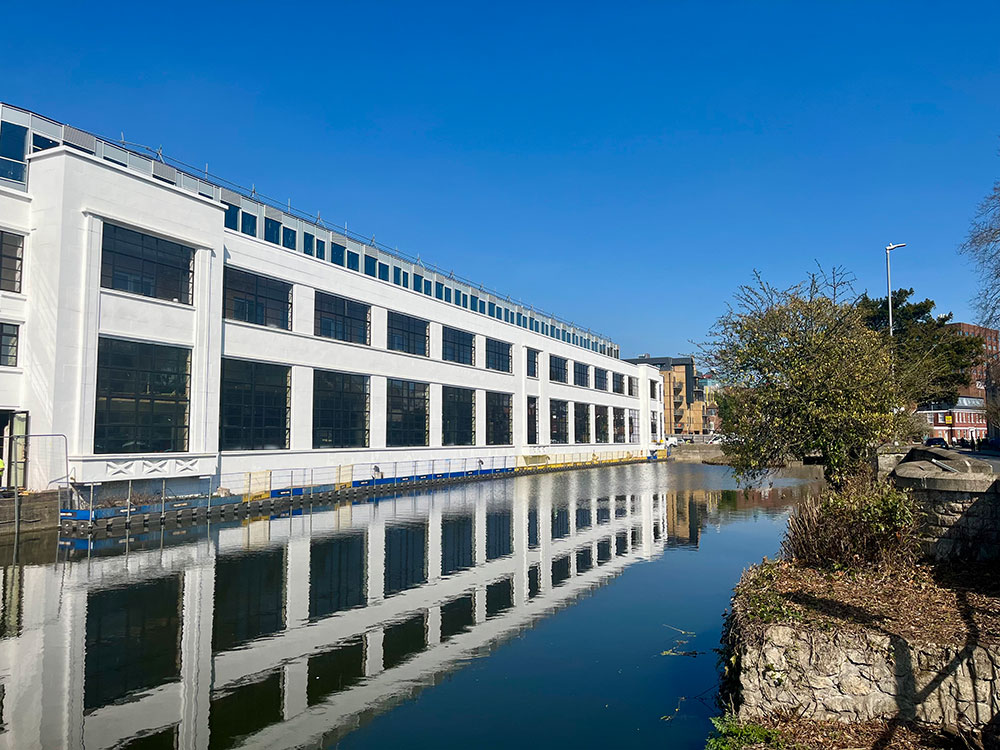 The existing box mullion wind posts to the River Len Elevation were refurbished by needle gunning each post to remove surface rust, primed and painted with a rust inhibitor and overclad with channel pressings, polyester powder coated to match the new W20 window frames. Many of the W20 windows to the first floor, known as “The Winter Garden”, provide an enclosed balcony space for the residential units, providing views out over the River Len.