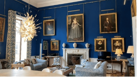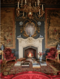 The room is painted a dark blue to bring out the colours of the much- faded tapestries. In keeping with the baroque spirit, the decoration is extensively gilded. Everything in the room, apart from the antiques, paintings, and tapestries, was made in the UK within the past eighteen months. The crafts used for this room include hand-carved timber classical ornament, traditional run plasterwork, scagliola manufacture and gilding.