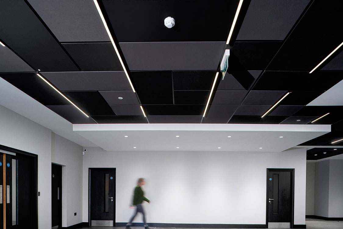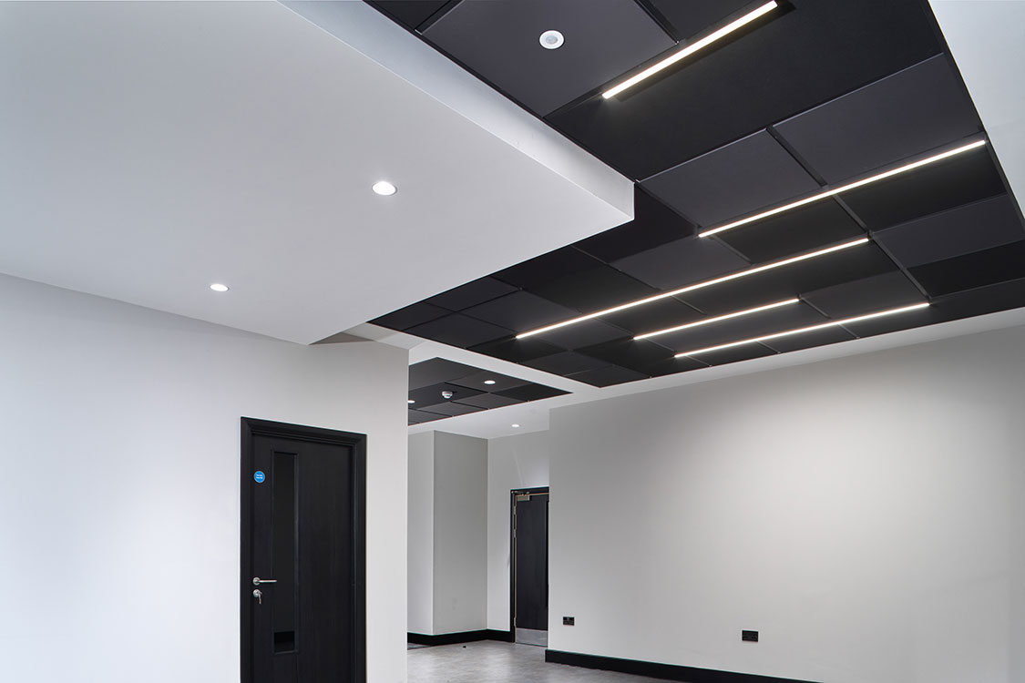 Zentia worked closely with the architect and client to translate their vision into a practical, high-impact design. The ceiling was installed using Prestige tiles in black and dark grey as well as Zentia’s Gridline system, providing both texture and depth. The client drew inspiration from Zentia’s own recent head office refurbishment, which helped inform the final concept design.
