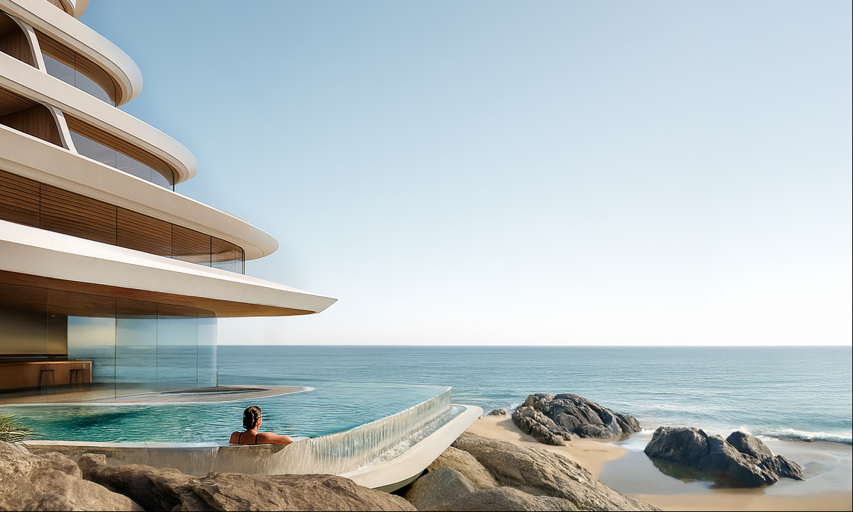 A continuation of the existing rock formations within the site, the design follows the contours of the shoreline, articulated as a series of stepped horizontal terraces, courtyards and gardens that echo the site’s varied topography. The composition, orientation and materiality of the hotel have been informed by detailed investigations of its oceanfront site.